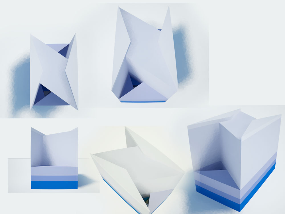 "Triangolo Aureo" E' stato scavato un parallelepipedo a base quadrasta seguendo una forma trinagolare che si ripete rimpcciolendosi, come se fosse una figura frattale e infine specchiato. In pianta è stata seguita la forma propria del triangolo, mentre nei prospetti le altezze sono ricavate dalle punte dei trinagol. Questo processo può essere ripetuto su una qualsiasi forma ottenendo molteplici risultati.